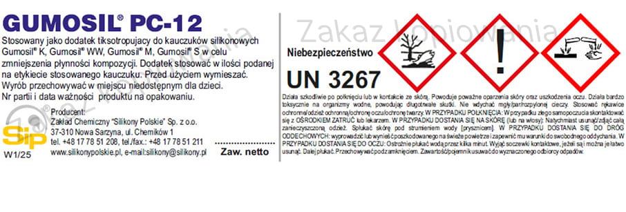 Kauczuk dwuskładnikowy typu GUMOSIL® PC-12 jest preparatem tiksotropowym zmieniającym zdolność płynięcia kompozycji kauczuków typu: GUMOSIL® K, GUMOSIL® WW, GUMOSIL® M, GUMOSIL® S. GUMOSIL®PC-12 znajduje zastosowanie w produkcji form „ płaszczowych) z kauczuków silikonowych nadając kompozycji charakter wysoce niepłynny co umożliwia jego nakładanie przy zastosowaniu pędzla malarskiego lub łopatki do uzyskania grubości warstwy ok. 10 mm. i „ zdejmowanie” form z modeli pionowych . Środki tiksotropowe znacznie skracają czas przydatności kauczuku do aplikacji, dlatego w celu przedłużenia „ żywotności” masy kauczukowej można obniżyć dawkę katalizatora. Dla większości modeli zaleca się przygotowanie kauczuku ze środkiem tiksotropowym porcjami umożliwiającymi nałożenie ich w ciągu 10 -15 minut.
