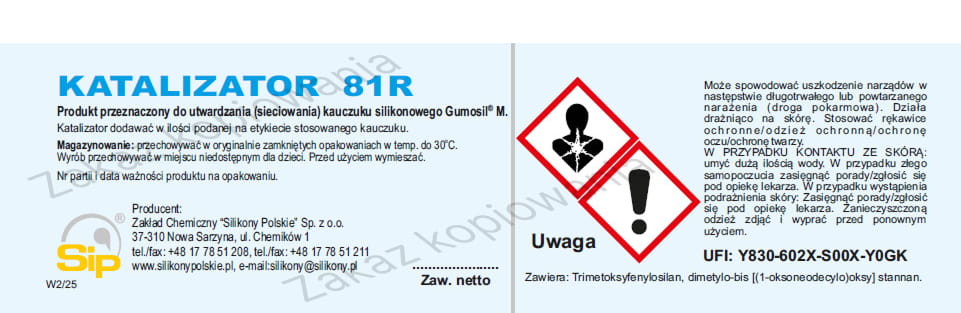 Katalizator stosuje się w ilości: 5 części wagowych na 100 części wagowych Gumosilu®